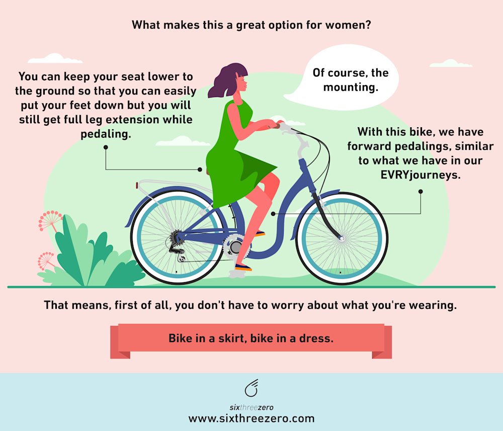 So what makes this a great option for women? Of course, the mounting. That means, first of all, you don't have to worry about what you're wearing. Bike in a skirt, bike in a dress. You don't have to worry about lifting your leg over the seat. You can just simply step through and from here, of course, it's going to be really easy to ride. You just slip back onto the seat. So with this bike, we have forward pedalings, similar to what we have in our EVRYjourneys. What that means is the pedals are a little forward, not directly below the seat as they are with some bikes